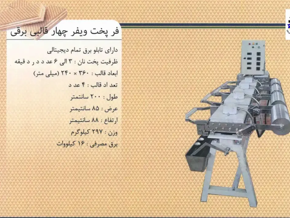 تم تأسيس الشركة الايرانية في عام 1398 وهدفها هو إنتاج خط كامل لإنتاج بسكويت ويفر وفرن طبخ أنواع بسكويت ايس كريم ساندويش أوتوماتيكية.
